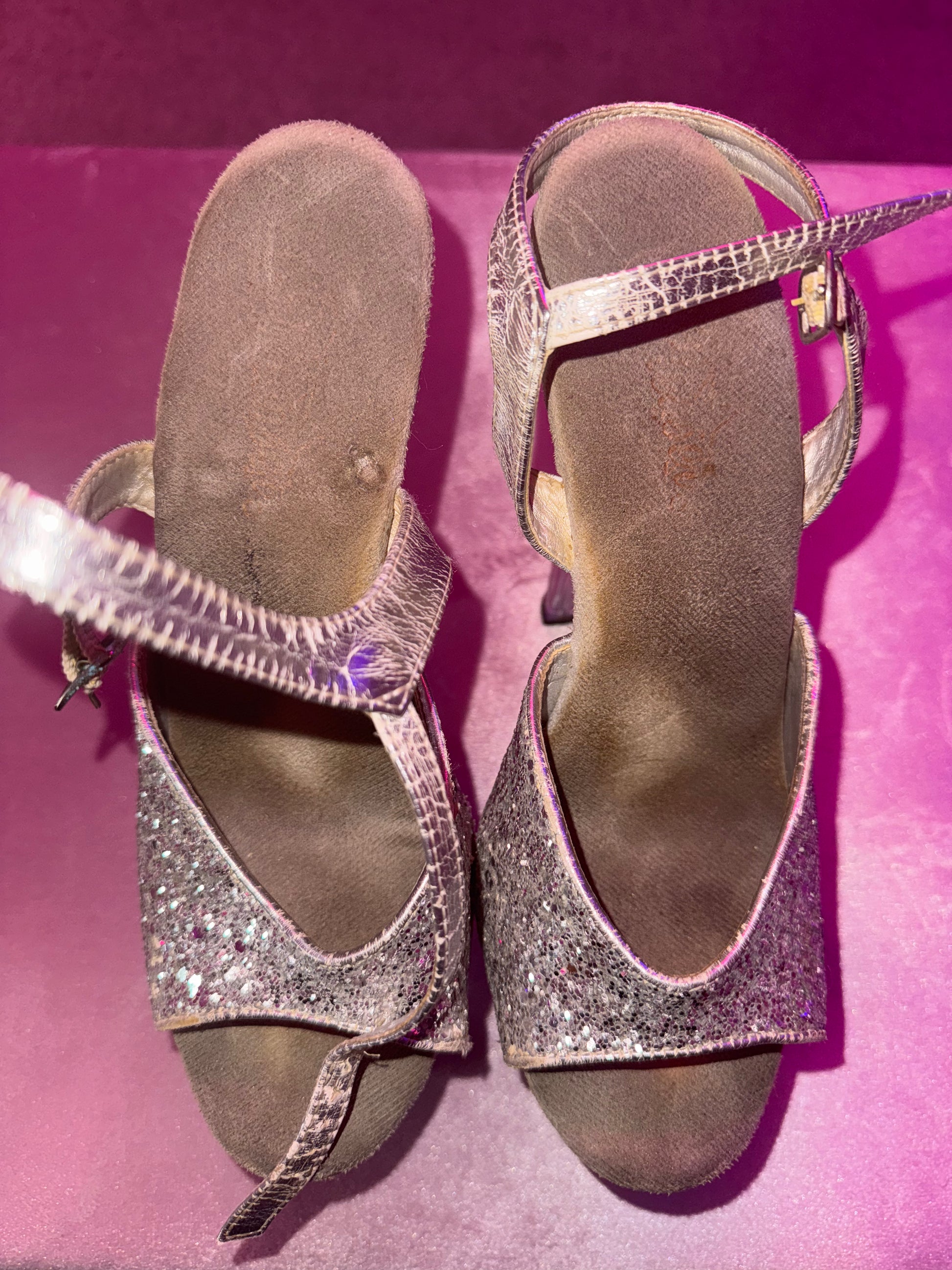A wore out pair of stripper heels, pleasers brand. Worn over 4 years while dancing long nights in the strip club.